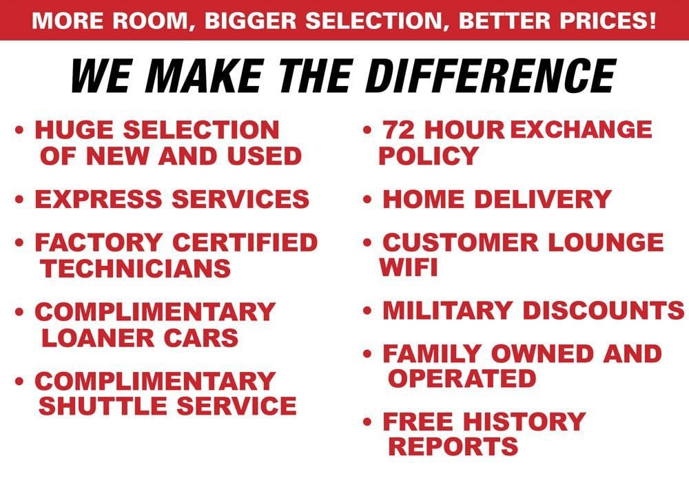 *All rebates applied to “advertised pricing” is on in-stock units only and includes all applicable dealer discounts, manufacturer discounts, and incentives. Price excludes dealer fee of $998, tax, tag, title, and electronic filing fee; as well as, dealer installed options which is $2,192 Vehicle Protection Plan (includes: Nitrogen Filled Tires, Floor Mats, Hand Painted Pinstripe, 3M Door Edge Guards and 3M Door Cups, Splash Guards, Windshield Treatment (3yr/36k), Coupon Savings Book (Savings up to $1500), Ins. Deductible reimbursement (1st year up $500 ). Financing must be obtained through Dealer Financing or lose $1,000 Finance Assist to get VIP price for New or Used Vehicles. Average Reconditioning cost must be added to all used car VIP pricing. A copy of the advertisement must be presented at time of purchase to receive any special or advertised price. Prior sales are excluded. Cannot be combined with website offers. We attempt to update this inventory regularly; however, there can be lag time between the sale of a vehicle and the updating of inventory. Please contact us to verify availability. Everyone may not qualify for ALL REBATES. * The efficiencies of eCommerce permit us to offer eCommerce consumers pricing benefits. Therefore prices on this site are available only to consumers who initiate their transactions via email or the contact mechanism of this site. *Pre-Owned Internet Pricing is Only Available for Prime Lender Financing (680+ FICO Score). Financing must be obtained through Dealer Financing or lose $1000 Finance Assist to get price for Used Vehicles. Average reconditioning cost must be added to all used car pricing
