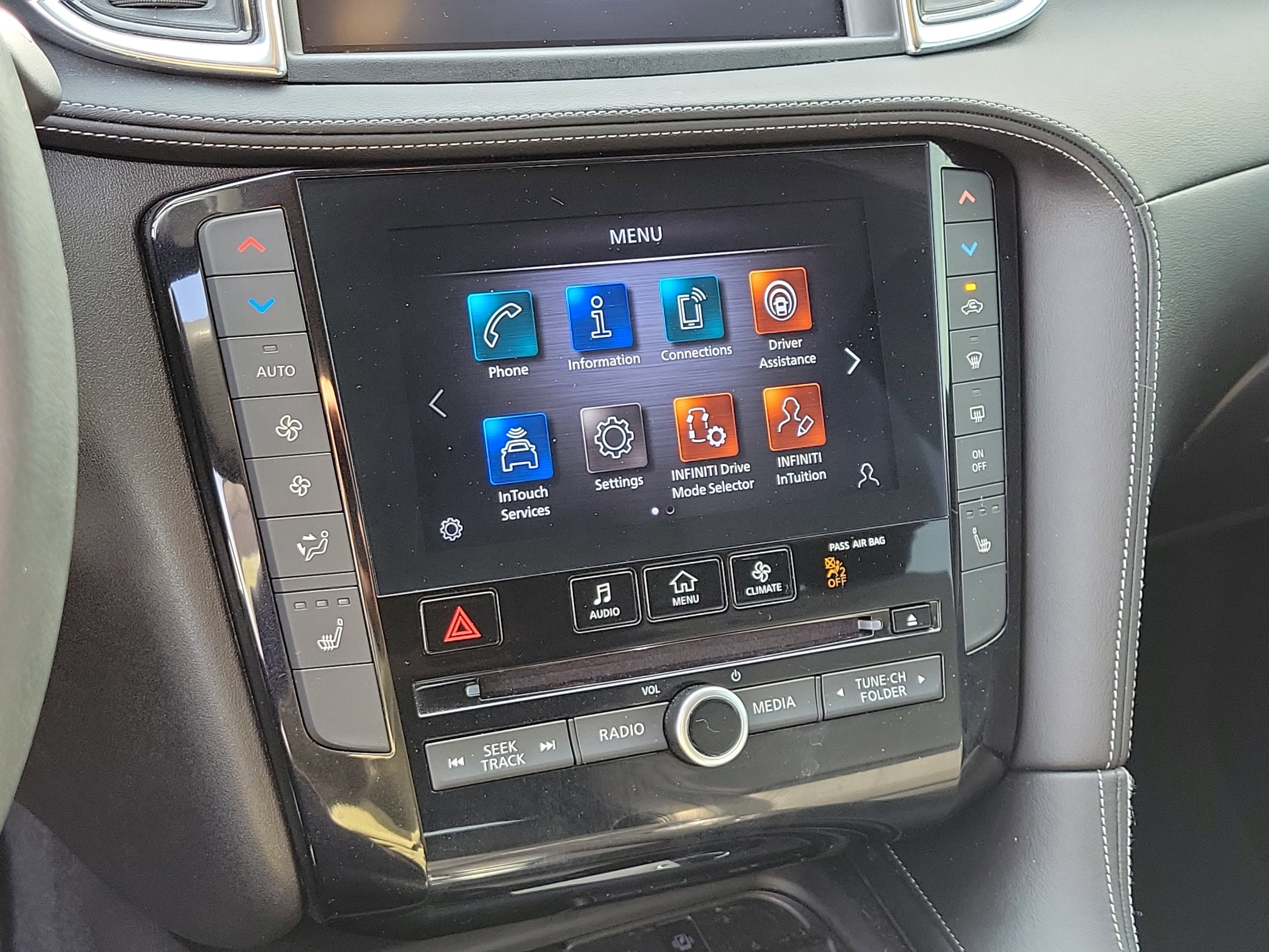 - Radio: HD Audio System -inc: INFINITI InTouch, INFINITI InTouch services, INFINITI InTouch dual display system w/upper 8" and lower 7" HD touch screens, wireless Apple CarPlay, Android Auto, HD radio technology, SiriusXM radio w/advanced audio features and 90-day complimentary trial, INFINITI voice recognition, Siri Eyes Free, Wi-Fi hotspot and active noise cancellation